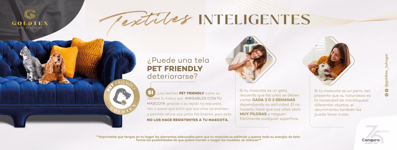 Las colecciones textiles amigables para mascotas, son telas que cuentan con tecnología de punta anti-enganche, lo que minimiza el riesgo de que las uñas de las mascotas se enreden en las fibras de los muebles, evitando que se rasguen. Además, las características de estas telas, pueden repeler los pelos de las mascotas, facilitando el proceso de limpieza en el hogar.