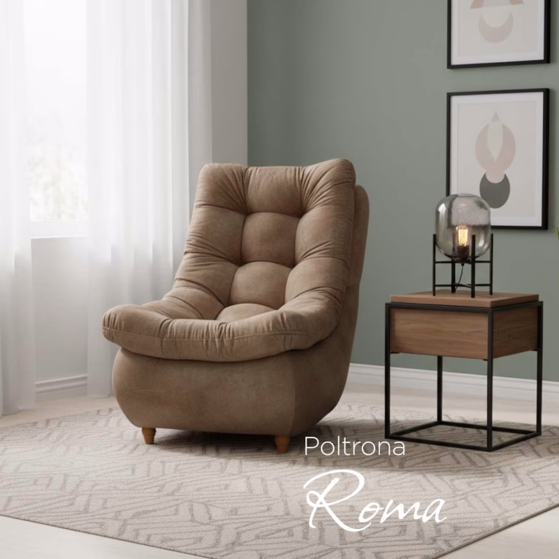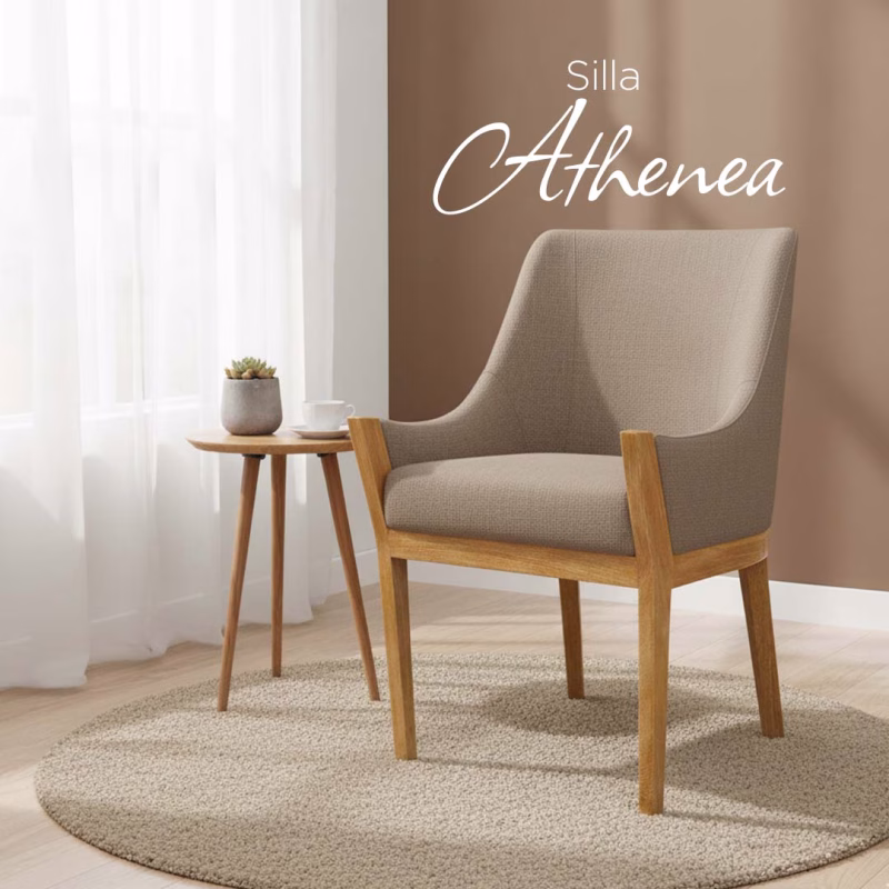 - Conjunto Completo: Incluye un sofá de 1.40 cm de ancho con patas cónicas de madera, una poltrona con patas cónicas de madera, un puff baúl con patas de madera, una mesa de centro y dos cojines decorativos.